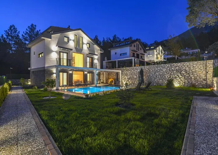 In the idyllic Ovacik region, the Fethiye Ovacik Luxury Villa - 7171 stands as a paragon of elegance and tranquility. This exquisite haven showcases a perfect blend of modern comforts and traditional charm, offering an unparalleled sanctuary for discerning travelers seeking relaxation and adventure. Surrounded by lush greenery and mountains, the villa captures the essence of a serene getaway while being conveniently located just moments away from vibrant local attractions.